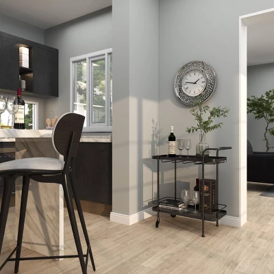 This stunning wall clock is ideal for modern, art deco, and glam-themed living spaces. Requires 1 AA battery, not included. This item ships in 1 carton. Features Roman numerals for the hour and minute markers. The clock mechanism runs silent. Can be hung vertically using the D-rings on the back; nails and screws not included. Suitable for indoor use only. This item ships fully assembled in one piece. This is a single white colored kitchen clock. Glam style.