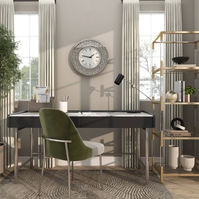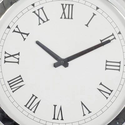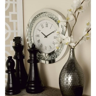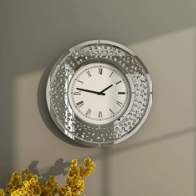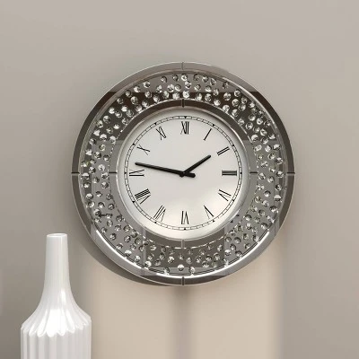 - Glam wall clock showcases a silver matte iron finish and a clear glass finish with stud accents