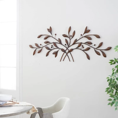 Add a delicate touch to your traditional-themed home space with this leaf branch art decor displayed on your vanilla or pastel-painted wall. This item ships in 1 carton. Features overlapping branches with small berry-like fruits. Can be hung horizontally using the keyholes on the back; nails and screws not included. Suitable for indoor use only. This item ships fully assembled in one piece. This is a single brown colored wall sculptures. Traditional style.