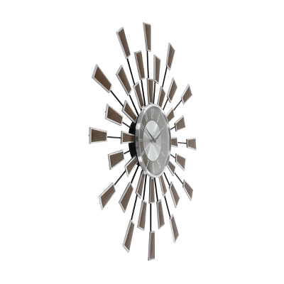 This modern metal wall clock features protruding spokes with rectangular spokes creating a windmill shaped design. Requires 1 AA battery. Battery not included. This item ships in 1 carton. The clock features silver number markers with a brown highlight and a pair of black clock hands in a sliver background. The clock mechanism runs silent. Iron wall clock makes a great gift for any occasion. Can be hung vertically using the keyholes on the back; nails and screws not included. Suitable for indoor use only. This item ships fully assembled in one piece. This is a single brown colored kitchen clock. Modern style.