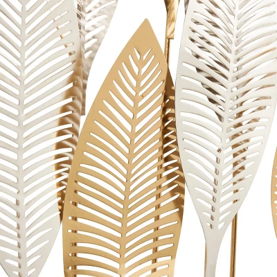 - The gold wall decor features an abstract design with metallic layered leaf shapes, creating a visually captivating and artistic composition