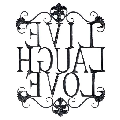 Place this on any blank wall space adding both texture and depth to your home. This live laugh love wall decor provides your traditional style inspired living space with a nice mantra adding a calming boost. This item ships in 1 carton. Iron wall decor makes a great gift for any occasion. Can be hung horizontally using the sawtooths on the back; nails and screws not included. Suitable for indoor use only. This is a single brown colored wall sculptures. Traditional style. LIVE LAUGH LOVE metal motivational wall art.