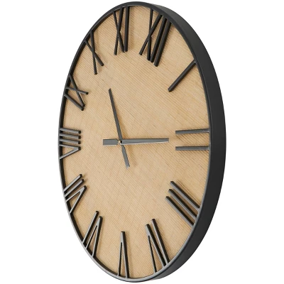 Hang this clock on your wall to add a stylish and functional accent to your home decor. Requires 1 AA battery, not included. This item ships in 1 carton. Clock face features Roman numerals for the hour markers along the outer edges of the clock. The clock mechanism runs silent. Can be hung vertically using the keyholes on the back; nails and screws not included. Suitable for indoor use only. This item ships fully assembled in one piece. This is a single light brown colored oversized wall clock. Farmhouse style.