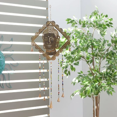 Serene Buddha windchime is ideal for bohemian, artistic, and eclectic-themed living spaces. This item ships in 1 carton. Metal windchime makes a great gift for any occasion. Iron chain is attached at the top section to allow for easy hanging ; nails and screws are not included. Suitable for indoor use only. This item ships fully assembled in one piece. Made in India. This is a single gold colored wind chime. Eclectic style.