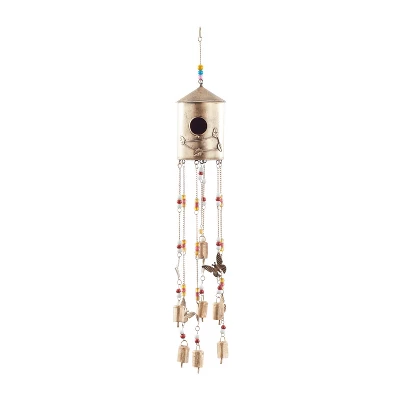 - •This fun birdhouse windchime features a distressed bronze metal finish and multi colored glass bead finishes