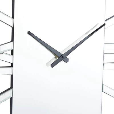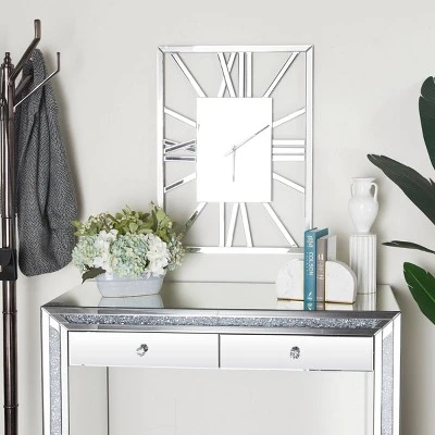 Like a functional art piece for your wall, this rectangular wall clock will become a focal point or finishing touch for any room in your glam-themed home with its elegant glass frame. Requires 1 AA battery, not included. This item ships in 1 carton. The clock features a silver rectangular clock face with Roman numerals and simple clock hands. The clock mechanism runs silent. Can be hung vertically using the D-rings on the back; nails and screws not included. Suitable for indoor use only. This item ships fully assembled in one piece. This is a single silver colored oversized wall clock. Glam style.