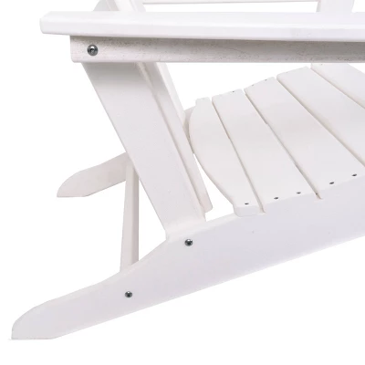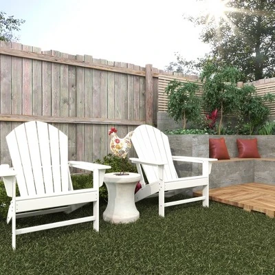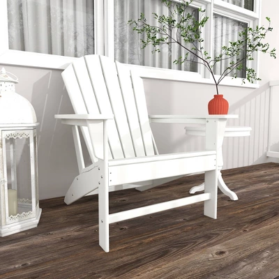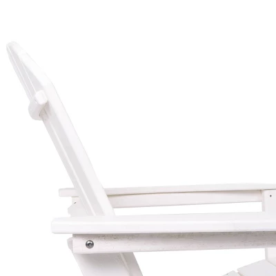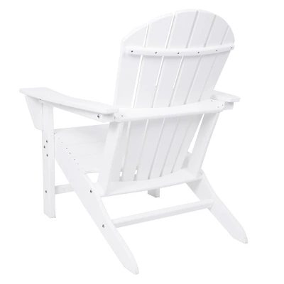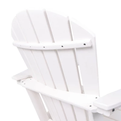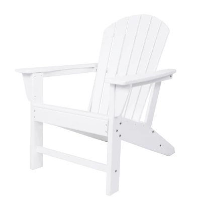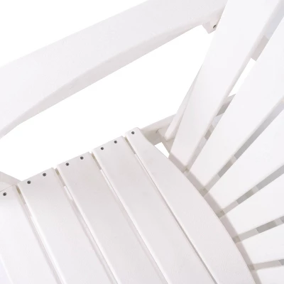 The perfect chair to lounge with comfortable thick slats to help keep your posture supported. White Adirondack chair that you can sink into with high back and arm rest that you can place near the pool or by your garden as you enjoy the outdoors. This item ships in 1 carton. This durable and weather resistance chair feature a low profile tilt seating with high slats for back support. This item also feature a high arm rest for your comfort and convenient.. Suitable for indoor and outdoor use. Some assembly required. Maximum weight limit is 250 lbs. Can accommodate 1 person. This is a single white colored fire pit chair. Traditional style. Resin is resistant to weather and temperature fluctuations and is non-hydroscopic. It does not absorb water or moisture from the air.