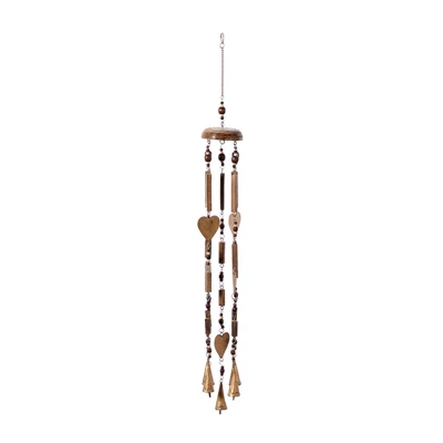 - •Designed with five hanging iron heart figures and five iron bells in a distressed gold finish, with round brown and white glass bead string accents