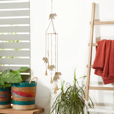 A light and delicate piece to create a whimsical atmosphere anywhere in your home. The soothing sound of this windchime will keep you relax and rejuvenated throughout the day. An enchanting musical art piece that create a delicate touch and whimsical atmosphere anywhere in your home. This item ships in 1 carton. Metal windchime makes a great gift for any occasion. Item features metal ring for easy and secure hang; nails and screws are not included. Suitable for indoor and outdoor use. This item ships fully assembled in one piece. Made in India. This is a single gold colored wind chime. Eclectic style.