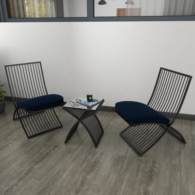 - This outdoor lounge set includes black metal frames, blue cushion seats, and a glass tabletop