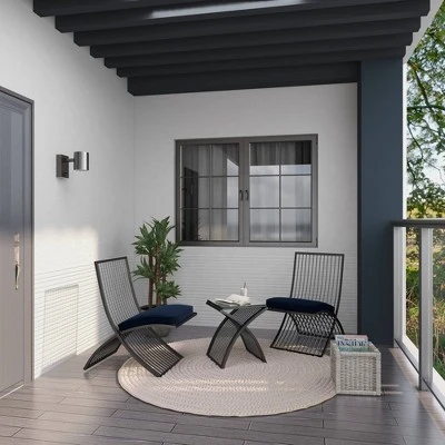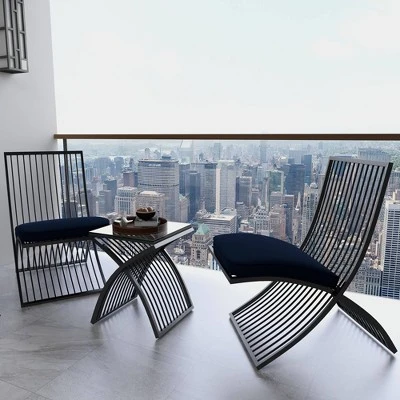 This metal outdoor furniture set can be displayed and used in the garden, patio, poolside, or veranda for lounging. Cushions should be stored indoors when not in use. Make your outdoor patio an ideal place for gatherings and entertaining for your love ones. An all weather seating set that will keep you connected to nature and the outdoors at the end of hard working day . This item ships in two cartons. Use water with simple cleaning solution on the wooden legs and wipe dirt off with a soft cloth, rag or paper towels. Cushions should be stored indoors when not in use. The fabric will fade over time, be sure to turn cushions regularly to equalize the color change. Polyester cushion cover is removable and washable with soap and water. Suitable for indoor and outdoor use. Maximum weight limit is 50 lbs. Use water with simple cleaning solution on the wooden legs and wipe dirt off with a soft cloth, rag or paper towels. This seating set can accommodate 2 seating capacity. This outdoor furniture set includes 2 lounge chairs and a small glass table. Iron structure are painted with a special coating to help protect it from the elements, iron may show signs of corrosion in salt air environments. Eclectic design.