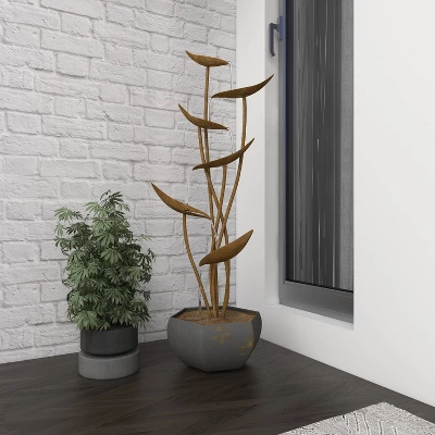 - It has 4 metal boat-shaped leaves that pour water onto each other. Such design concept allows water to cascade smoothly to mimic the sound of a flowing stream