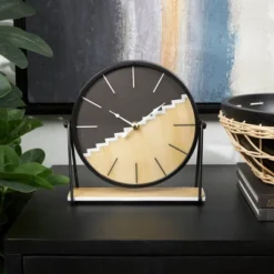 To use this clock, simply mount it on your desired wall or place it on a flat surface, ensuring it’s visible for easy time reading. Requires 1 AA battery, not included. This item ships in 1 carton. This clock has a black and brown wood face separated in half diagonally, white and black hashmarks, and white hands. The clock mechanism runs silent. Mdf clock makes a great gift for any occasion. Suitable for indoor use only. This item ships fully assembled in one piece. This is a single black colored mantel clock. Modern style.