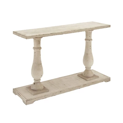 - •Farmhouse wood console table features 2 pillar columns as legs attached to a rectangular base with a slight elevation and additional bottom storage