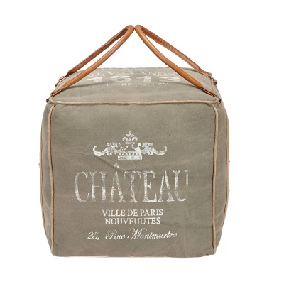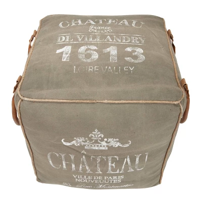 A rustic square pouf that combines style and comfort. Make a bold statement by placing in the entryway, lobby, living room, or bedroom. This item ships in 1 carton. Suitable for indoor use only. This item ships fully assembled in one piece. Maximum weight limit is 250 lbs. Made in India. This is a single gray colored foot stool. Rustic style. A rustic square pouf showcasing “Chateau France De Villandry 1613, Loire Valley” typographies.