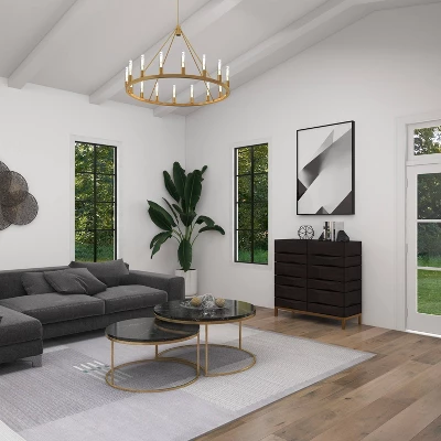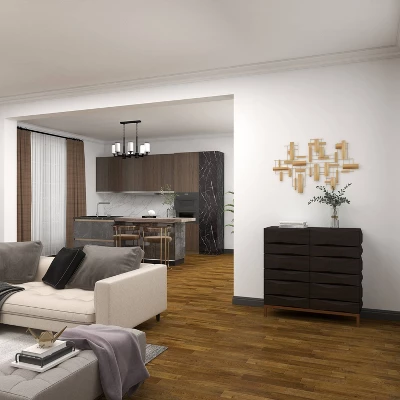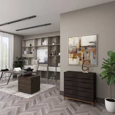 - •Accent cabinet with doors highlights brown and gold finishes that bring a sophisticated look