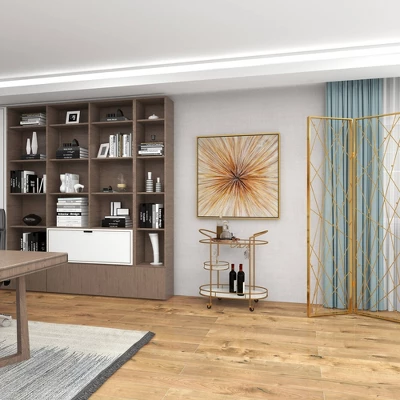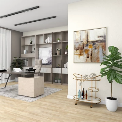 - •Contemporary indoor bar cart that highlights an oblong structure with round caster wheels