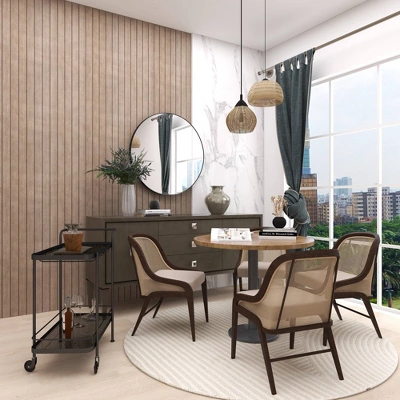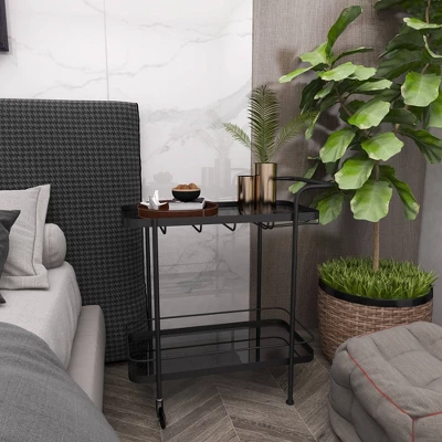 - This stunning bar cart comes in a simple yet elegant black finishing This accent furniture goes well with any home decoration due to its neutral color