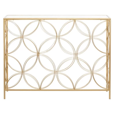Bring a finishing touch to your home with an inviting appeal with this console table. A sturdy and long lasting construction for a years of enjoyment. Give your home a luxurious feel with this stunning gold metal with glass top side table that will compliment other sleek metal furniture and bold color background. This item ships in 1 carton. Suitable for indoor use only. This item ships fully assembled in one piece. Maximum weight limit is 100 lbs. This is a single gold colored entryway table. Contemporary style.