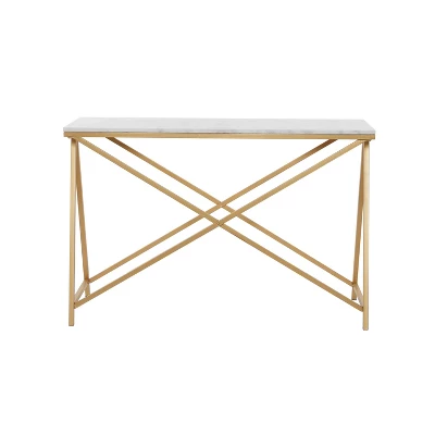 - •A bold “X” trestle legs in chic gold supports the marbled top that brings an opulent touch to this console table