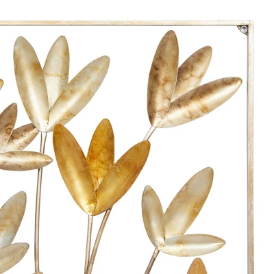 - This iridescent orange, yellow, and brown leaves wall decor is housed inside a rectangle metal frame