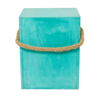 - An outdoor stool featuring an aquamarine square structure furnished with a brown burlap rope that serves as a handle