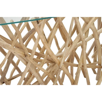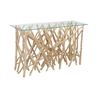 - •This console table features a unique base design made from a lot of thin teak wood branches holding the glass table surface