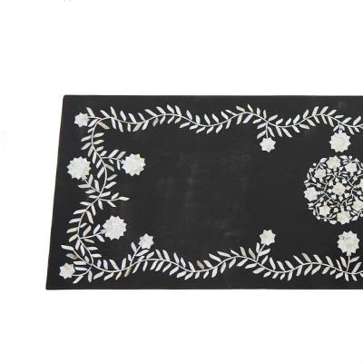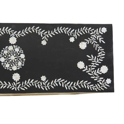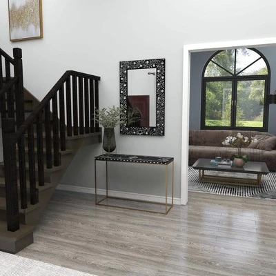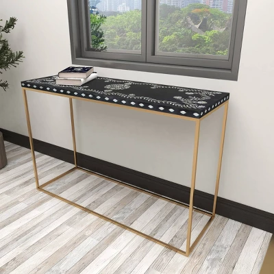 - This narrow console table showcases a reliable construction of stainless steel and medium-density fiberboard, the tabletop is inlayed with oyster shell forming flowers and diamonds