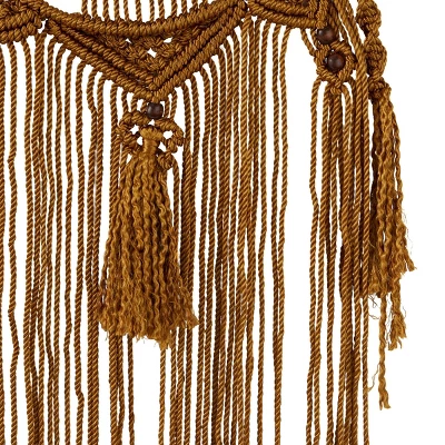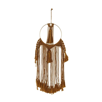 Maximize your open wall and eliminate any negative space with this eye catching wall decor. An extravagant display in a captivating design to elevate the look of your home. Create a focal point hanging string art as you place this enchanting decor near glass windows, doorways, and the inner balcony area. This item ships in 1 carton. Fabric wall decor makes a great gift for any occasion. Can be hung vertically using the cotton cord; nails and screws not included. Suitable for indoor use only. This item ships fully assembled in one piece. Made in India. This is a single brown colored wall sculptures. Bohemian style.