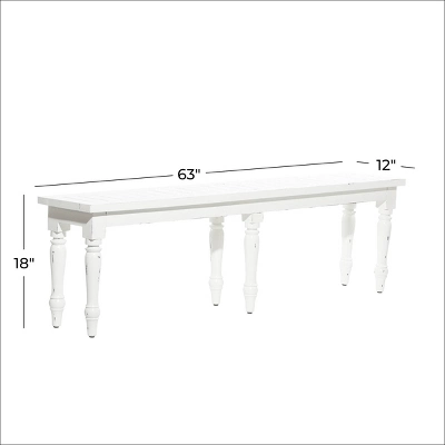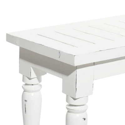 So take a load off and relax on this decorative bench. A small piece of furniture that make a big difference to give your home an instance refresh. This vintage piece will be a great addition to your chic farmhouse style home with dark solid-colored backgrounds. Designed with felt or rubber stoppers at the base that prevent scratching furniture and table tops, as well as sliding around. This item ships in 1 carton. Wooden bench features a seat with 1.12” thickness. Suitable for indoor use only. This item ships fully assembled in one piece. Maximum weight limit is 250 lbs. Made in Indonesia. Can accommodate 3 people. This is a single white colored entryway bench. Farmhouse style.