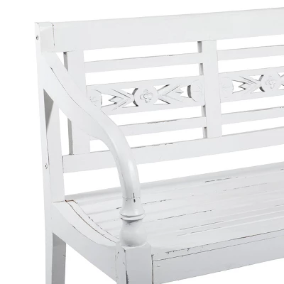 So take a load off and relax on this decorative bench. A small piece of furniture that make a big difference to give your home an instance refresh. White farmhouse bench carries a blend of style and function and will complement light colored pillows and natural grass baskets. This item ships in 1 carton. Suitable for indoor use only. Some assembly required. Maximum weight limit is 400 lbs. Made in Indonesia. Can accommodate 2 people. This is a single white colored entryway bench. Farmhouse style.