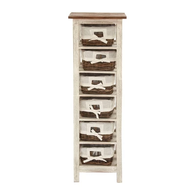 - •Wood shelving unit features shelves that supports 6 brown wicker baskets with tied linen lining and cutout slots for easy carry and storage