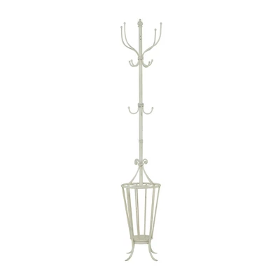 Great for hanging coats, purses, scarves, and more, this coat rack is as functional as it is stylish. Create a storage for your belongings while keeping them protected and off the surface floor. Enjoy style and function with this free standing coat rack with umbrella stand, and place it in your entryway or hallway to complement your farmhouse-themed indoor aesthetics. This item ships in 1 carton. Suitable for indoor use only. This item ships fully assembled in one piece. Maximum weight limit is 25 lbs. This is a single white colored freestanding coat and hat rack. Farmhouse style.