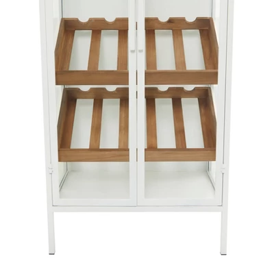 - The wine bottle racks are enclosed within a metal body frame cabinet with tempered glass doors