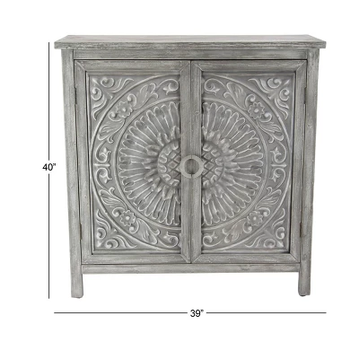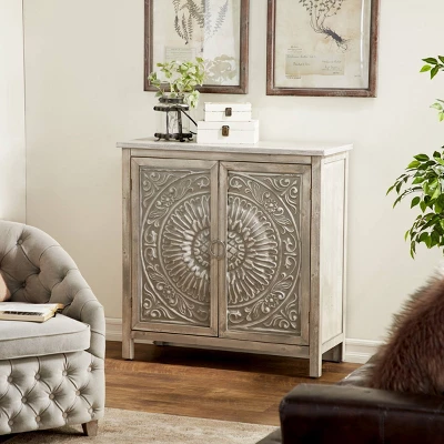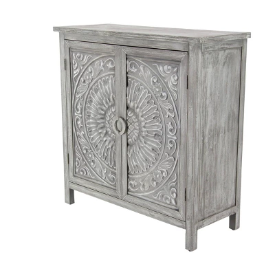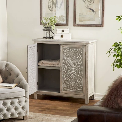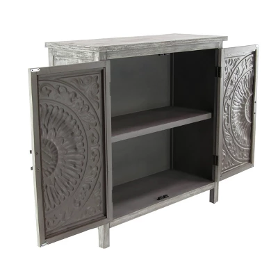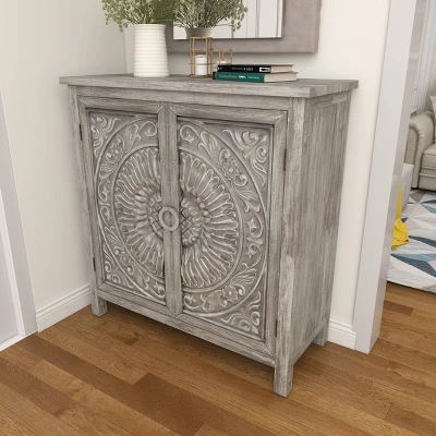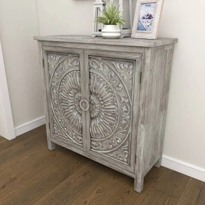 - •Farmhouse storage cabinet features ornate wood carvings on the doors and an internal shelf with circular metal handles for easy open