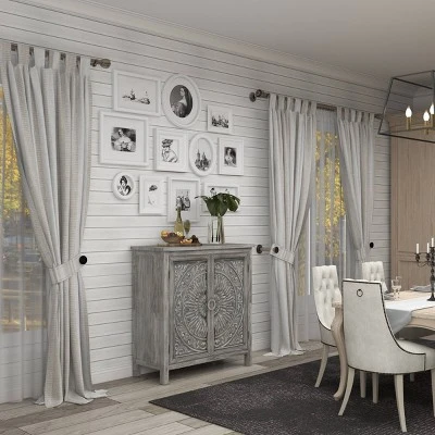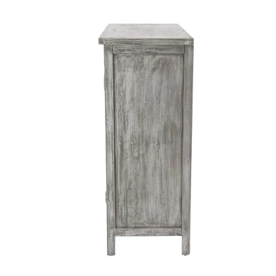- •Wooden storage cabinet has a distressed gray finish that fits with a farmhouse aesthetic