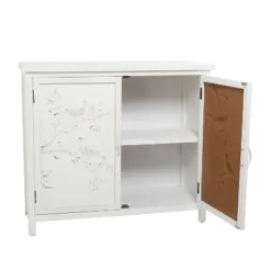 Organize your belongings and display decor with this elegant and rustic farmhouse storage cabinet to flatter your living room or bedroom space. A practical yet stylish upgrade that instantly elevate the look of your room. Maintain a clutter free zone and stay organize with this chic cabinet. Designed with black rubber stoppers at the base that prevent scratching on floor surface, as well as sliding around. This cabinet has 2 doors. Item comes shipped in one carton. Suitable for indoor use only. Furnished with 1 interior shelf. Farmhouse design. Maximum weight limit is 100 lbs. Furnished with 1 interior shelf. This item comes with mounting hardware to prevent tipping.