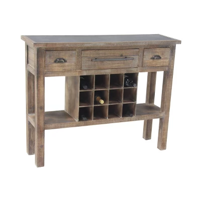 - This rectangular wine console table sports distressed gray table top, brown drawers and wine storage, and brass pull handles