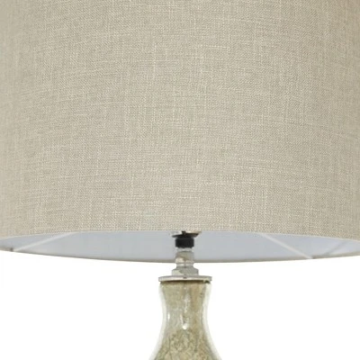 Neutral yet rich in texture, this beige glass table lamp features glossy and reflective mercury glass with beige hues throughout the transparent, vase shaped base with a marbled effect. The modern and glam inspired drum lamp shade is a soft wheat beige linen that softly diffuses light. The stem and bottom rim are a reflective polished silver, adding some extra shine. This glass lampshade is designed with a black rubber stopper at the base that prevents scratching furniture and table tops, as well as sliding around. Uses one standard E26 bulb (not included). This item has a 64″ cord. Suitable for indoor use only. This item carries a drum shape shade. This item conveniently turns on and off via a switch. This item comes shipped in one carton. Due to the nature of this item, no two will be alike, there will be slight differences in shape, size, and color.