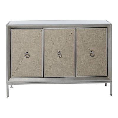 - •Cabinet with mirrored top carries light metallic champagne frame, beige upholstered doors, polished silver ring handles, and soft black-painted interior