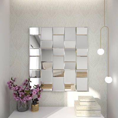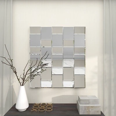 This large silver wall mirror is the perfect addition to a gallery wall or entryway. This item ships in 1 carton. Designed with asymmetrical mosaic mirrors fixed on the frame. Can be hung vertically using the D-rings on the back; nails and screws not included. Suitable for indoor use only. This item ships fully assembled in one piece. This is a single silver colored entryway mirror. Glam style.
