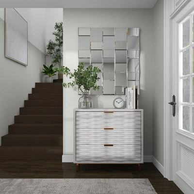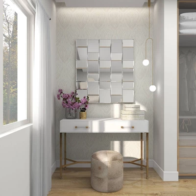 - •This wood wall mirror has a silver finish that’s ideal for a glam-style room