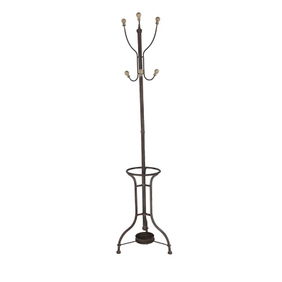 - •This standing coat rack carries a solid black metal exterior and brown wood knobs