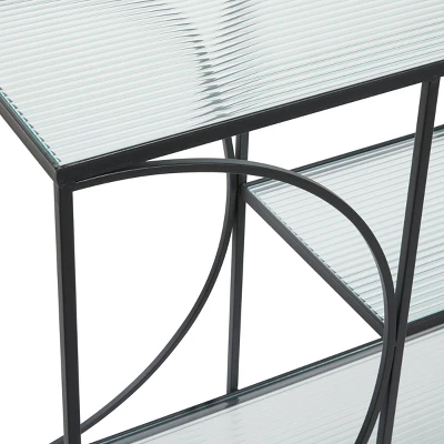 - This industrial console table highlights a obsidian black frame finish with clear ribbed glass tops