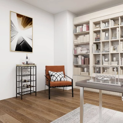 This contemporary-inspired wine storage provides you a perfect wine bottle and glass storage solution. It is designed with round stoppers at the base that prevent scratching and sliding. This item ships in 1 carton. Suitable for indoor use only. A wine storage with 4 metal shelves. Contemporary style. This metal and wood wine storage has a storage capacity of 15 bottles.