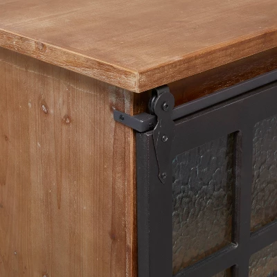 - A wine cabinet with sliding door that is made of robust and long-lasting metal, wood, and glass materials