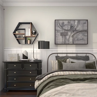 - •Black metal floating shelf with hexagon silhouette and interior geometric shapes formed by the black metal and natural golden brown wood slats and