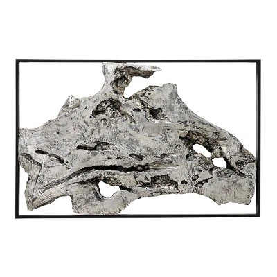 - Distressed metallic silver finish over the abstract art sculpture housed in a smooth, black metal frame