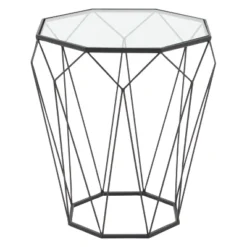 - Black side table with open grid geometric base that forms an octagon at the top and a smaller octagon at the bottom and transparent glass inlay