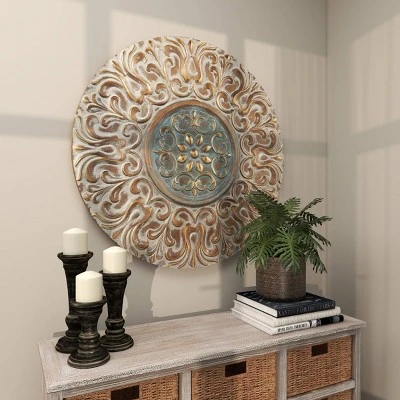 - This wall plaque decor comes in a round profile with elaborate flower, leaves, and vine carvings